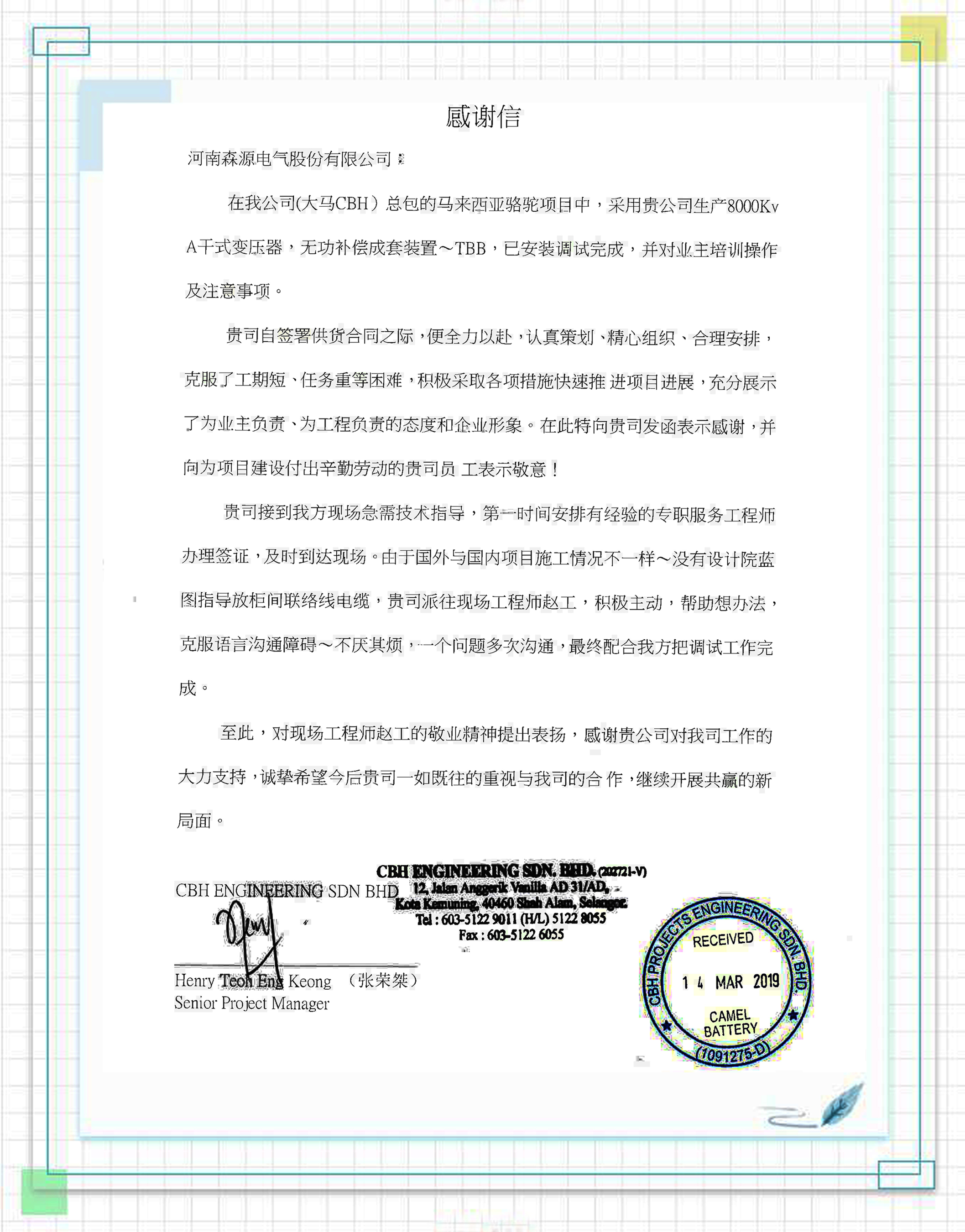 在赵治国回国后,客户写给公司的一封感谢信也漂洋过海传到了万搏一站式服务官网。大马CBH公司在对万搏一站式服务官网表示感谢的同时,更希望今后双方能够继续合作,开拓共赢的新局面。与大马CBH公司的合作,只是万搏一站式服务官网电气诸多海外业务中的一项。随着国家“一带一路”倡议的深入实施,万搏一站式服务官网电气海外业务的拓展不断取得新突破,产品在非洲、东南亚、中亚、南美洲等地的重点项目建设工程中多次应用,不断得到用户的好评。