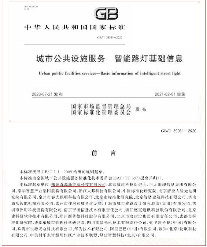 10月份,由郑州万搏一站式服务官网新能源作为第一起草单位的国家标准《城市公共设施服务 智能路灯基础信息》,获得了国家市场监督管理总局、国家标准化管理委员会批准。