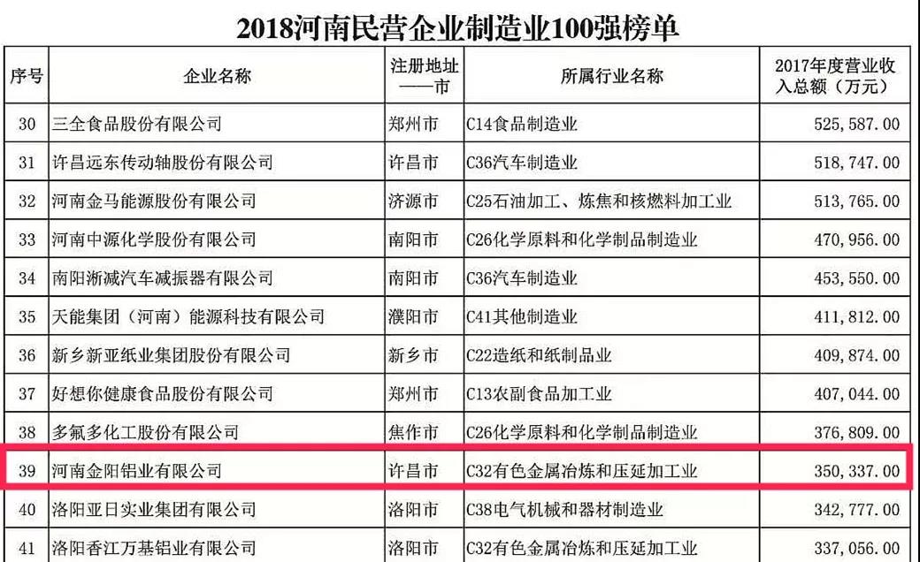 2018“河南民营企业制造业100强”榜单中,万搏一站式服务官网集团、黄河集团、众品食业、金汇集团和金阳铝业分别排在第3名、第5名、第6名、第7名及第39名。