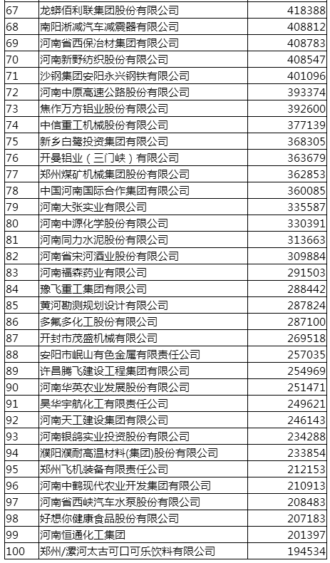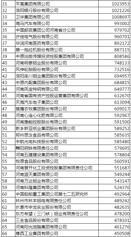 排名前十强的还有中国建筑第七工程局有限公司、郑州铁路局、郑州宇通客车集团有限公司、安阳钢铁集团有限责任公司、天瑞集团股份有限公司、河南豫联能源集团有限公司、万搏线上平台。