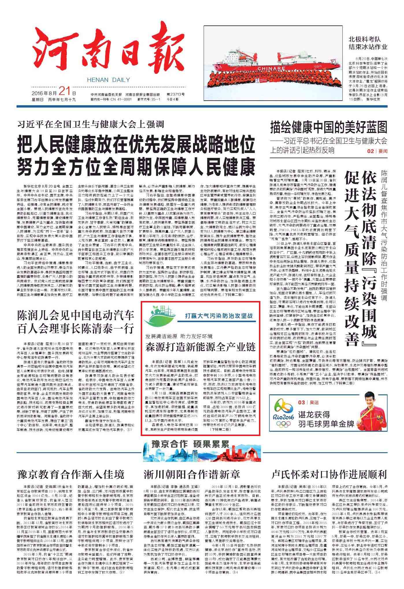 8月21日,《河南日报》头版以《发展清洁能源助力友好环境万搏一站式服务官网打造新能源全产业链》为题,对万搏一站式服务官网集团的发展情况进行了专题报道。文章指出:“从风能发电、光伏发电到智能充电桩、新能源汽车,近年来,河南万搏一站式服务官网集团抓住国家大力发展新能源产业的机会,打造出较为完整的新能源产业链条,为减少碳排放量、建设节能环保社会贡献了一份力量。”